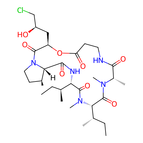 | SMILES | CC[C@H](C)[C@@H]1NC(=O)[C@@H]2[C@@H](C)CCN2C(=O)[C@@H](C[C@@H](O)CCl)OC(=O)CCNC(=O)[C@H](C)N(C)C(=O)[C@H]([C@@H](C)CC)N(C)C1=O |