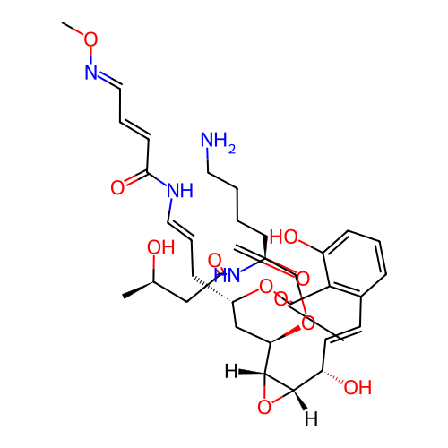 | SMILES | CON=CC=CC(=O)NC=CC[C@H]1C[C@@H](OC(=O)[C@H](CCCCN)NC(=O)C[C@@H](C)O)[C@H]2O[C@H]2[C@@H](O)C=CC2=C(C(=O)O1)C(O)=CC=C2 |