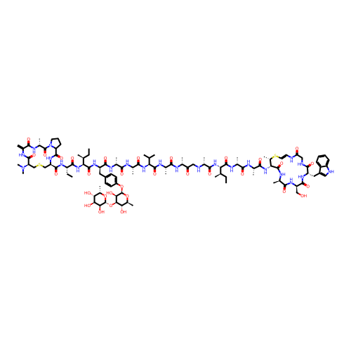 | SMILES | C=C1NC(=O)[C@H](N(C)C)CSC[C@H](C(=O)N[C@@H](CC)C(=O)N[C@H](C(=O)N[C@H](CC2=CC=C(O[C@H]3O[C@@H](C)[C@H](O)[C@@H](O[C@H]4O[C@@H](C)[C@@H](O)[C@H](O)[C@@H]4O)[C@H]3O)C=C2)C(=O)N[C@H](C)C(=O)N[C@@H](C)C(=O)N[C@H](C(=O)N[C@@H](C)C(=O)N[C@H](C)C(=O)CN[C@H](C)C(=O)N[C@H](C(=O)N[C@H](C)C(=O)N[C@@H](C)C(=O)N[C@H]2C(=O)N[C@H](C)C(=O)N[C@H](CO)C(=O)N[C@@H](CC3=CNC4=CC=CC=C34)C(=O)NCC(=O)N/C=C/S[C@H]2C)[C@H](C)CC)C(C)C)[C@@H](C)CC)NC(=O)C2CCCN2C(=O)[C@@H](C)NC1=O |