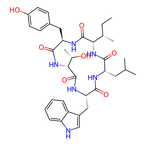| SMILES | CC[C@H](C)[C@@H]1NC(=O)[C@H](CC(C)C)NC(=O)[C@H](CC2=CNC3=CC=CC=C23)NC(=O)[C@@H]([C@H](C)O)NC(=O)[C@@H](CC2=CC=C(O)C=C2)NC1=O |
