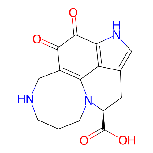 | InChI | InChI=1S/C15H15N3O4/c19-13-8-6-16-2-1-3-18-9(15(21)22)4-7-5-17-11(14(13)20)10(7)12(8)18/h5,9,16-17H,1-4,6H2,(H,21,22)/t9-/m0/s1 |