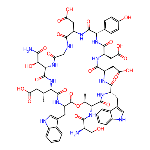 | SMILES | C[C@@H]1OC(=O)C(CC2=CNC3=CC=CC=C23)NC(=O)[C@@H]([C@H](C)CC(=O)O)NC(=O)[C@H]([C@@H](O)C(N)=O)NC(=O)CNC(=O)[C@@H](CC(=O)O)NC(=O)[C@H](C2=CC=C(O)C=C2)NC(=O)[C@@H](CC(=O)O)NC(=O)[C@@H](CC(=O)O)NC(=O)[C@H](CC2=CNC3=CC=CC=C23)NC(=O)[C@@H]1NC(=O)[C@H](N)CO |