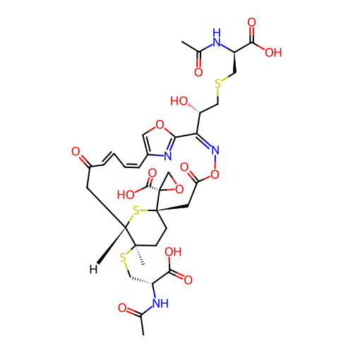 | SMILES | CC(=O)N[C@H](CSC[C@@H](O)/C1=N/OC(=O)C[C@@]2([C@@]3(C(=O)O)CO3)CC[C@@](C)(SC[C@@H](NC(C)=O)C(=O)O)[C@H](CC(=O)/C=C/C=C\C3=COC1=N3)S2)C(=O)O |