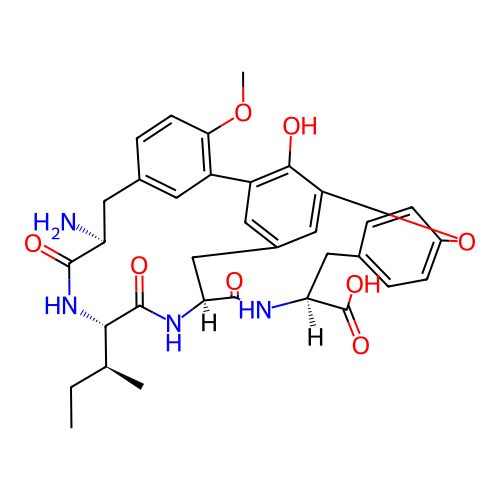 | SMILES | CC[C@H](C)[C@@H]1NC(=O)[C@@H](N)CC2=CC(=C(OC)C=C2)C2=C(O)C3=CC(=C2)C[C@H](NC1=O)C(=O)N[C@H](C(=O)O)CC1=CC=C(C=C1)O3 |