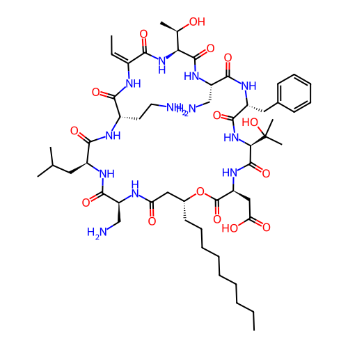 | SMILES | C/C=C1/NC(=O)[C@H](CCN)NC(=O)[C@H](CC(C)C)NC(=O)[C@H](CN)NC(=O)C[C@@H](CCCCCCCCC)OC(=O)[C@H](CC(=O)O)NC(=O)[C@H](C(C)(C)O)NC(=O)[C@@H](CC2=CC=CC=C2)NC(=O)[C@H](CN)NC(=O)[C@H]([C@@H](C)O)NC1=O |