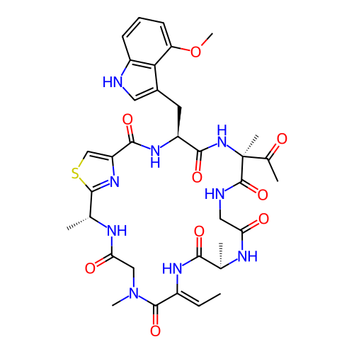 | SMILES | C/C=C1\NC(=O)[C@@H](C)NC(=O)CNC(=O)[C@](C)(C(C)=O)NC(=O)[C@H](CC2=CNC3=C2C(OC)=CC=C3)NC(=O)C2=CSC(=N2)[C@@H](C)NC(=O)CN(C)C1=O |