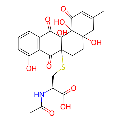 | SMILES | CC(=O)N[C@@H](CSC12CCC3(O)CC(C)=CC(=O)C3(O)C1(O)C(=O)C1=C(C2=O)C(O)=CC=C1)C(=O)O |