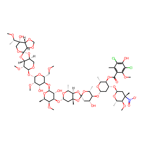 | SMILES | COC[C@H]1O[C@@H](O[C@@H]2OC[C@@H]3O[C@@]4(OC[C@@](O)([C@H](C)OC)[C@@H]5OCO[C@H]54)O[C@H]3[C@H]2OC)[C@@H](OC)[C@@H](O)[C@@H]1O[C@@H]1O[C@H](C)[C@H](OC)[C@H](O[C@H]2C[C@@]3(C)O[C@@]4(C[C@@H](O)[C@H](O[C@H]5C[C@@H](O[C@H]6C[C@](C)([N+](=O)[O-])[C@@H](OC)[C@H](C)O6)[C@H](OC(=O)C6=C(C)C(Cl)=C(O)C(Cl)=C6OC)[C@@H](C)O5)[C@@H](C)O4)O[C@@H]3[C@@H](C)O2)[C@H]1O |