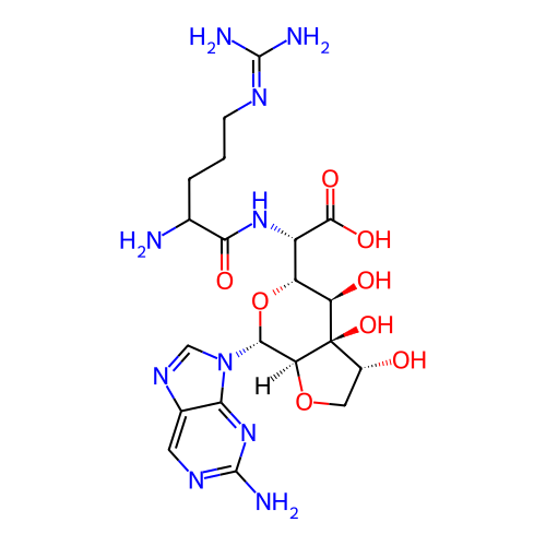 | SMILES | NC(N)=NCCCC(N)C(=O)N[C@H](C(=O)O)[C@H]1O[C@@H](N2C=NC3=CN=C(N)N=C32)[C@@H]2OC[C@@H](O)[C@@]2(O)[C@@H]1O |
