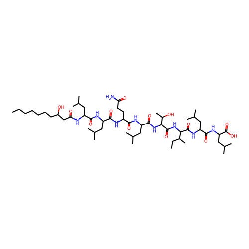 | SMILES | CCCCCCCC(O)CC(=O)NC(CC(C)C)C(=O)NC(CC(C)C)C(=O)NC(CCC(N)=O)C(=O)NC(CC(C)C)C(=O)NC(C(=O)NC(C(=O)NC(CC(C)C)C(=O)NC(CC(C)C)C(=O)O)C(C)CC)C(C)O |