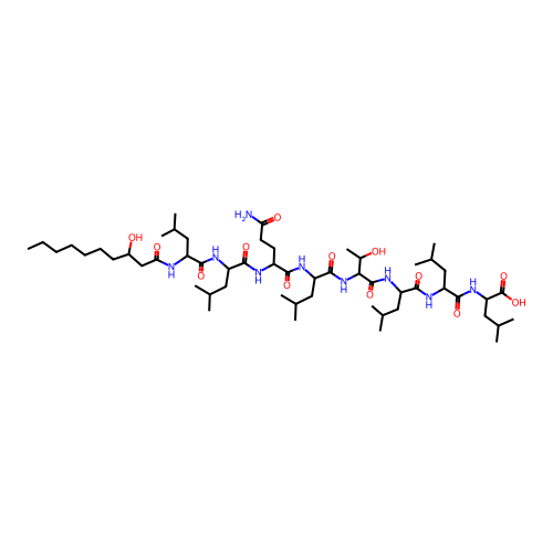 | SMILES | CCCCCCCC(O)CC(=O)NC(CC(C)C)C(=O)NC(CC(C)C)C(=O)NC(CCC(N)=O)C(=O)NC(CC(C)C)C(=O)NC(C(=O)NC(CC(C)C)C(=O)NC(CC(C)C)C(=O)NC(CC(C)C)C(=O)O)C(C)O |