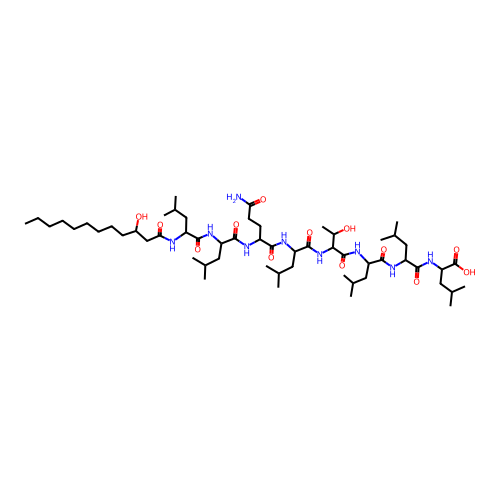 | SMILES | CCCCCCCCCC(O)CC(=O)NC(CC(C)C)C(=O)NC(CC(C)C)C(=O)NC(CCC(N)=O)C(=O)NC(CC(C)C)C(=O)NC(C(=O)NC(CC(C)C)C(=O)NC(CC(C)C)C(=O)NC(CC(C)C)C(=O)O)C(C)O |