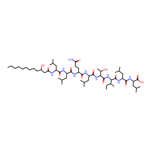 | SMILES | CCCCCCCCCC(O)CC(=O)NC(CC(C)C)C(=O)NC(CC(C)C)C(=O)NC(CCC(N)=O)C(=O)NC(CC(C)C)C(=O)NC(C(=O)NC(C(=O)NC(CC(C)C)C(=O)NC(CC(C)C)C(=O)O)C(C)CC)C(C)O |