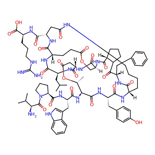 | SMILES | CC(C)C[C@@H]1NC(=O)[C@@H]2CC(=O)O[C@H](C)[C@H](NC(=O)[C@H](CC3=C[NH]C4=CC=CC=C34)NC(=O)[C@@H]3CCCN3C(=O)[C@@H](N)C(C)C)C(=O)N[C@@H](CC3=CC=C(O)C=C3)C(=O)N[C@H]3CCCCNC(=O)C[C@@H](C(=O)N[C@@H](CCCNC(=N)N)C(=O)O)NC(=O)[C@H](CCC(=O)OC[C@H](NC(=O)[C@@H]4CCCC4C(=O)[C@H](CC4=CC=CC=C4)NC3=O)C(=O)N2)NC1=O |