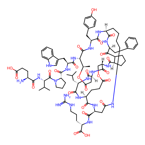| SMILES | CC(C)C[C@@H]1NC(=O)[C@@H]2CC(=O)O[C@H](C)[C@H](NC(=O)[C@H](CC3=C[NH]C4=CC=CC=C34)NC(=O)[C@@H]3CCCN3C(=O)[C@@H](NC(=O)[C@@H](N)CCC(=O)O)C(C)C)C(=O)N[C@@H](CC3=CC=C(O)C=C3)C(=O)N[C@H]3CCCCNC(=O)C[C@@H](C(=O)N[C@@H](CCCNC(=N)N)C(=O)O)NC(=O)[C@H](CCC(=O)OC[C@H](NC(=O)[C@@H]4CCCC4C(=O)[C@H](CC4=CC=CC=C4)NC3=O)C(=O)N2)NC1=O |