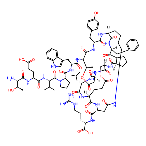| SMILES | CC(C)C[C@@H]1NC(=O)[C@@H]2CC(=O)O[C@H](C)[C@H](NC(=O)[C@H](CC3=C[NH]C4=CC=CC=C34)NC(=O)[C@@H]3CCCN3C(=O)[C@@H](NC(=O)[C@H](CCC(=O)O)NC(=O)[C@@H](N)[C@@H](C)O)C(C)C)C(=O)N[C@@H](CC3=CC=C(O)C=C3)C(=O)N[C@H]3CCCCNC(=O)C[C@@H](C(=O)N[C@@H](CCCNC(=N)N)C(=O)O)NC(=O)[C@H](CCC(=O)OC[C@H](NC(=O)[C@@H]4CCCC4C(=O)[C@H](CC4=CC=CC=C4)NC3=O)C(=O)N2)NC1=O |