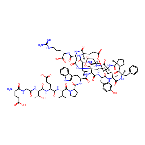 | SMILES | CC(C)C[C@@H]1NC(=O)[C@@H]2CC(=O)O[C@H](C)[C@H](NC(=O)[C@H](CC3=C[NH]C4=CC=CC=C34)NC(=O)[C@@H]3CCCN3C(=O)[C@@H](NC(=O)[C@H](CCC(=O)O)NC(=O)[C@@H](NC(=O)CNC(=O)[C@@H](N)CCC(=O)O)[C@@H](C)O)C(C)C)C(=O)N[C@@H](CC3=CC=C(O)C=C3)C(=O)N[C@H]3CCCCNC(=O)C[C@@H](C(=O)N[C@@H](CCCNC(=N)N)C(=O)O)NC(=O)[C@H](CCC(=O)OC[C@H](NC(=O)[C@@H]4CCCC4C(=O)[C@H](CC4=CC=CC=C4)NC3=O)C(=O)N2)NC1=O |