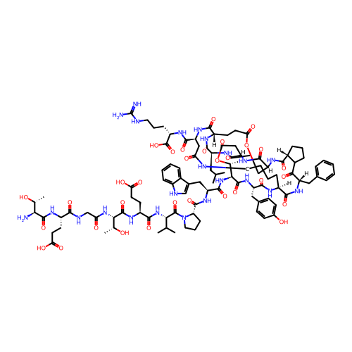 | SMILES | CC(C)C[C@@H]1NC(=O)[C@@H]2CC(=O)O[C@H](C)[C@H](NC(=O)[C@H](CC3=C[NH]C4=CC=CC=C34)NC(=O)[C@@H]3CCCN3C(=O)[C@@H](NC(=O)[C@H](CCC(=O)O)NC(=O)[C@@H](NC(=O)CNC(=O)[C@H](CCC(=O)O)NC(=O)[C@@H](N)[C@@H](C)O)[C@@H](C)O)C(C)C)C(=O)N[C@@H](CC3=CC=C(O)C=C3)C(=O)N[C@H]3CCCCNC(=O)C[C@@H](C(=O)N[C@@H](CCCNC(=N)N)C(=O)O)NC(=O)[C@H](CCC(=O)OC[C@H](NC(=O)[C@@H]4CCCC4C(=O)[C@H](CC4=CC=CC=C4)NC3=O)C(=O)N2)NC1=O |