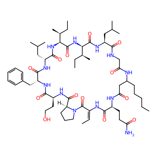 | SMILES | C/C=C1/NC(=O)[C@H](CCC(N)=O)NC(=O)CC(CCCCC)NC(=O)CNC(=O)[C@H](CC(C)C)NC(=O)[C@@H]([C@@H](C)CC)NC(=O)[C@H]([C@@H](C)CC)NC(=O)[C@@H](CC(C)C)NC(=O)[C@@H](CC2=CC=CC=C2)NC(=O)[C@H](CCO)NC(=O)[C@@H]2CCCN2C1=O |