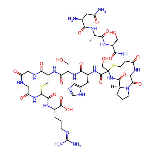 | SMILES | C[C@H](NC(=O)[C@@H](N)CC(N)=O)C(=O)N[C@@H](CO)C(=O)N[C@H]1CSC(CO)(C(=O)N[C@@H](CC2=CN=C[NH]2)C(=O)N[C@@H](CO)C(=O)NC2CSC(C(=O)N[C@@H](CCCN=C(N)N)C(=O)O)NC(=O)CNC(=O)CNC2=O)NC(=O)[C@@H]2CCCN2C(=O)CNC1=O |