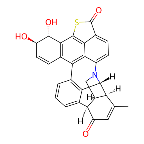 | InChI | InChI=1S/C30H21NO4S/c1-11-9-19(33)21-12-3-2-4-13-22-14-6-8-18(32)28(34)25(14)29-24-15(30(35)36-29)5-7-17(26(22)24)31-10-16(21)20(11)27(31)23(12)13/h2-9,16,18,20-21,27-28,32,34H,10H2,1H3/t16-,18+,20-,21-,27+,28-/m0/s1 |