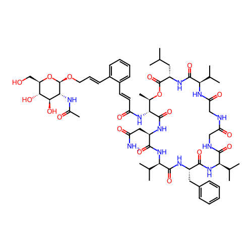 | SMILES | CC(=O)N[C@H]1[C@H](OC/C=C/C2=CC=CC=C2/C=C/C(=O)N[C@H]2C(=O)N[C@H](CC(N)=O)C(=O)N[C@H](C(C)C)C(=O)N[C@@H](CC3=CC=CC=C3)C(=O)N[C@H](C(C)C)C(=O)NCC(=O)NCC(=O)N[C@H](C(C)C)C(=O)N[C@@H](CC(C)C)C(=O)O[C@@H]2C)O[C@H](CO)[C@@H](O)[C@@H]1O |