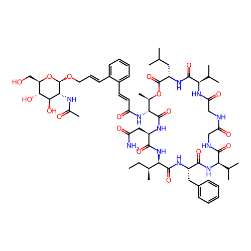 | SMILES | CC[C@H](C)[C@H]1NC(=O)[C@@H](CC(N)=O)NC(=O)[C@H](NC(=O)/C=C/C2=CC=CC=C2/C=C/CO[C@@H]2O[C@H](CO)[C@@H](O)[C@H](O)[C@H]2NC(C)=O)[C@@H](C)OC(=O)[C@H](CC(C)C)NC(=O)[C@@H](C(C)C)NC(=O)CNC(=O)CNC(=O)[C@@H](C(C)C)NC(=O)[C@H](CC2=CC=CC=C2)NC1=O |