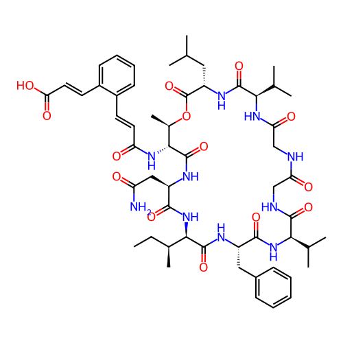 | SMILES | CC[C@H](C)[C@H]1NC(=O)[C@@H](CC(N)=O)NC(=O)[C@H](NC(=O)/C=C/C2=CC=CC=C2/C=C/C(=O)O)[C@@H](C)OC(=O)[C@H](CC(C)C)NC(=O)[C@@H](C(C)C)NC(=O)CNC(=O)CNC(=O)[C@@H](C(C)C)NC(=O)[C@H](CC2=CC=CC=C2)NC1=O |
