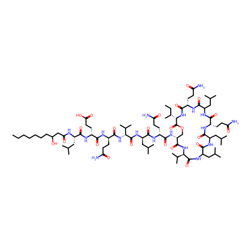 | SMILES | CCCCCCCC(O)CC(=O)N[C@@H](CC(C)C)C(=O)N[C@H](CCC(=O)O)C(=O)N[C@H](CCC(N)=O)C(=O)N[C@@H](C(=O)N[C@H](CC(C)C)C(=O)N[C@H](CCC(N)=O)C(=O)N[C@@H]1COC(=O)[C@H](C(C)CC)NC(=O)[C@H](CCC(N)=O)NC(=O)C(CC(C)C)NC(=O)[C@H](CCC(N)=O)NC(=O)C(CC(C)C)NC(=O)C(CC(C)C)NC(=O)[C@@H](C(C)C)NC1=O)C(C)C |
