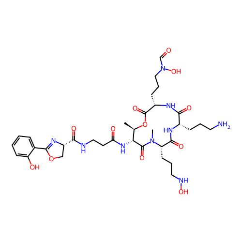 | SMILES | C[C@H]1OC(=O)[C@H](CCCN(O)C=O)NC(=O)[C@H](CCCN)NC(=O)[C@H](CCCNO)N(C)C(=O)[C@@H]1NC(=O)CCNC(=O)[C@@H]1COC(C2=CC=CC=C2O)=N1 |