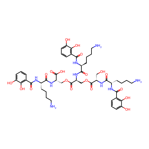 | SMILES | NCCCC[C@H](NC(=O)C1=C(O)C(O)=CC=C1)C(=O)N[C@@H](COC(=O)[C@H](COC(=O)[C@H](CO)NC(=O)[C@H](CCCCN)NC(=O)C1=C(O)C(O)=CC=C1)NC(=O)[C@H](CCCCN)NC(=O)C1=C(O)C(O)=CC=C1)C(=O)O |
