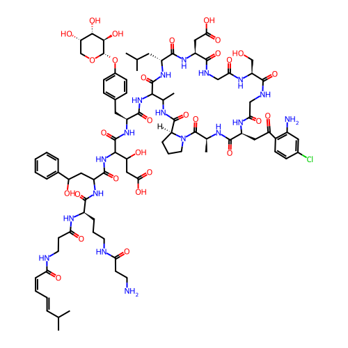| SMILES | CC(C)/C=C/C=C\C(=O)NCCC(=O)N[C@H](CCCNC(=O)CCN)C(=O)NC(CC(O)C1=CC=CC=C1)C(=O)NC(C(=O)N[C@@H](CC1=CC=C(O[C@@H]2OC[C@H](O)[C@H](O)[C@H]2O)C=C1)C(=O)NC1C(=O)N[C@H](CC(C)C)C(=O)N[C@@H](CC(=O)O)C(=O)NCC(=O)N[C@@H](CO)C(=O)NCC(=O)N[C@@H](CC(=O)C2=C(N)C=C(Cl)C=C2)C(=O)N[C@@H](C)C(=O)N2CCC[C@H]2C(=O)NC1C)C(O)CC(=O)O |