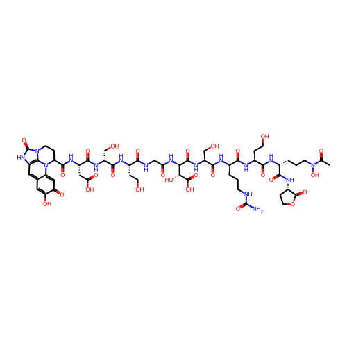 | SMILES | CC(=O)N(O)CCC[C@@H](NC(=O)[C@H](CCO)NC(=O)[C@@H](CCCNC(N)=O)NC(=O)[C@H](CO)NC(=O)[C@H](NC(=O)CNC(=O)[C@H](CCO)NC(=O)[C@@H](CO)NC(=O)[C@H](CC(=O)O)NC(=O)C1CCN2C(=O)[NH]C3=C2N1C1=CC(=O)C(O)=CC1=C3)[C@@H](O)C(=O)O)C(=O)N[C@H]1CCOC1=O |