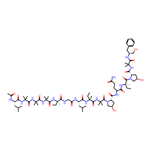 | SMILES | CC[C@@](C)(NC(=O)[C@H](CC(C)C)NC(=O)CNC(=O)[C@@](C)(CC)NC(=O)C(C)(C)NC(=O)C(C)(C)NC(=O)C(C)(C)NC(=O)[C@H](CC(C)C)NC(C)=O)C(=O)NC(C)(C)C(=O)N1C[C@H](O)C[C@H]1C(=O)NC(CCC(N)=O)C(=O)N[C@](C)(CC)C(=O)N1C[C@H](O)C[C@H]1C(=O)NC(C)(C)C(=O)N[C@H](CO)CC1=CC=CC=C1 |