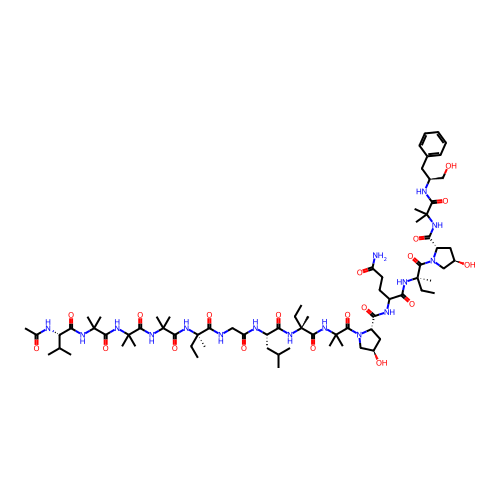 | SMILES | CC[C@@](C)(NC(=O)[C@H](CC(C)C)NC(=O)CNC(=O)[C@@](C)(CC)NC(=O)C(C)(C)NC(=O)C(C)(C)NC(=O)C(C)(C)NC(=O)[C@@H](NC(C)=O)C(C)C)C(=O)NC(C)(C)C(=O)N1C[C@H](O)C[C@H]1C(=O)NC(CCC(N)=O)C(=O)N[C@](C)(CC)C(=O)N1C[C@H](O)C[C@H]1C(=O)NC(C)(C)C(=O)N[C@H](CO)CC1=CC=CC=C1 |
