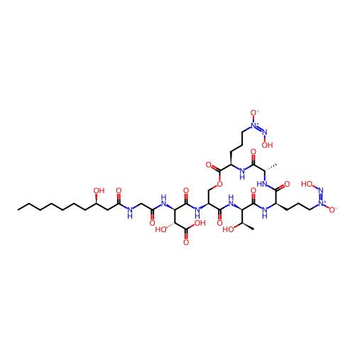 | SMILES | CCCCCCC[C@@H](O)CC(=O)NCC(=O)N[C@@H](C(=O)N[C@H]1COC(=O)[C@@H](CCC[N+]([O-])=NO)NC(=O)[C@H](C)NC(=O)[C@@H](CCC[N+]([O-])=NO)NC(=O)[C@@H]([C@@H](C)O)NC1=O)[C@@H](O)C(=O)O |