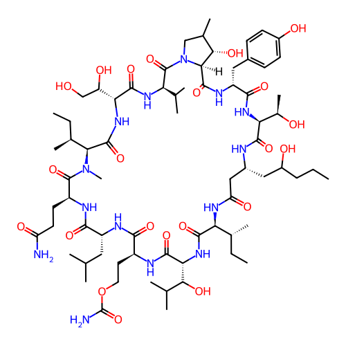 | SMILES | CCCC(O)C[C@@H]1CC(=O)N[C@@H]([C@H](C)CC)C(=O)N[C@H](C(O)C(C)C)C(=O)N[C@@H](CCOC(N)=O)C(=O)N[C@H](CC(C)C)C(=O)N[C@@H](CCC(N)=O)C(=O)N(C)[C@@H]([C@@H](C)CC)C(=O)N[C@H](C(O)CO)C(=O)N[C@H](C(C)C)C(=O)N2CC(C)[C@H](O)[C@H]2C(=O)N[C@H](CC2=CC=C(O)C=C2)C(=O)N[C@@H]([C@@H](C)O)C(=O)N1 |