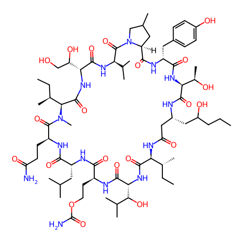 | SMILES | CCCC(O)C[C@@H]1CC(=O)N[C@@H]([C@H](C)CC)C(=O)N[C@H](C(O)C(C)C)C(=O)N[C@@H](CCOC(N)=O)C(=O)N[C@H](CC(C)C)C(=O)N[C@@H](CCC(N)=O)C(=O)N(C)[C@@H]([C@@H](C)CC)C(=O)N[C@H](C(O)CO)C(=O)N[C@H](C(C)C)C(=O)N2CC(C)C[C@H]2C(=O)N[C@H](CC2=CC=C(O)C=C2)C(=O)N[C@@H]([C@@H](C)O)C(=O)N1 |
