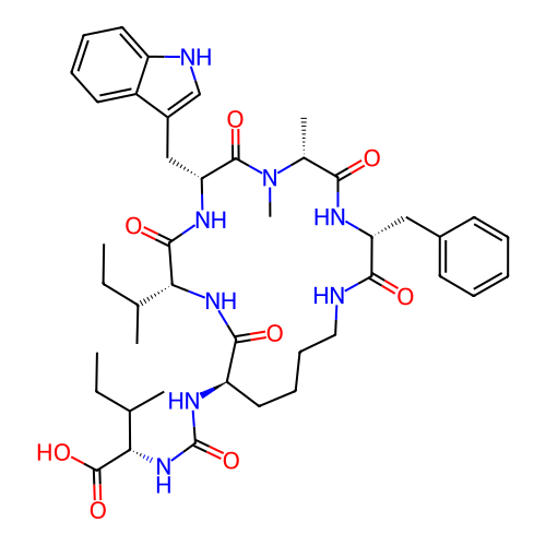 | SMILES | CCC(C)[C@H](NC(=O)N[C@@H]1CCCCNC(=O)[C@@H](CC2=CC=CC=C2)NC(=O)[C@@H](C)N(C)C(=O)[C@@H](CC2=CNC3=CC=CC=C23)NC(=O)[C@@H](C(C)CC)NC1=O)C(=O)O |