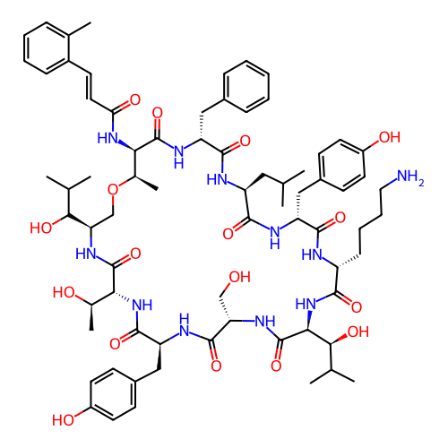 | SMILES | CC1=CC=CC=C1/C=C/C(=O)N[C@H]1C(=O)N[C@H](CC2=CC=CC=C2)C(=O)N[C@@H](CC(C)C)C(=O)N[C@H](CC2=CC=C(O)C=C2)C(=O)N[C@H](CCCCN)C(=O)N[C@@H]([C@@H](O)C(C)C)C(=O)N[C@@H](CO)C(=O)N[C@@H](CC2=CC=C(O)C=C2)C(=O)N[C@H]([C@@H](C)O)C(=O)N[C@@H](C(O)C(C)C)CO[C@@H]1C |