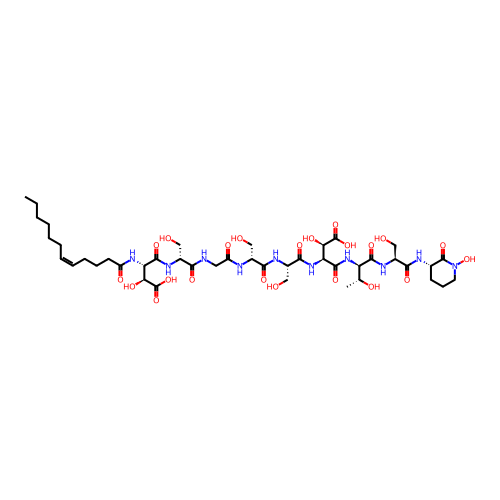 | SMILES | CCCCCC/C=C\CCCC(=O)N[C@H](C(=O)N[C@H](CO)C(=O)NCC(=O)N[C@H](CO)C(=O)N[C@@H](CO)C(=O)N[C@H](C(=O)N[C@@H](C(=O)N[C@@H](CO)C(=O)N[C@H]1CCCN(O)C1=O)[C@@H](C)O)[C@@H](O)C(=O)O)[C@H](O)C(=O)O |