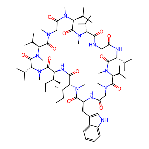 | SMILES | CC[C@H](C)[C@@H]1NC(=O)[C@@H]([C@@H](C)CC)N(C)C(=O)[C@H](CC2=C[NH]C3=CC=CC=C23)NC(=O)CN(C)C(=O)[C@H](C(C)C)N(C)C(=O)[C@@H](C(C)C)NC(=O)CNC(=O)[C@@H](C(C)C)N(C)C(=O)[C@H](C(C)C)N(C)C(=O)CN(C)C(=O)[C@H](C(C)C)N(C)C(=O)[C@@H](C(C)C)N(C)C1=O |