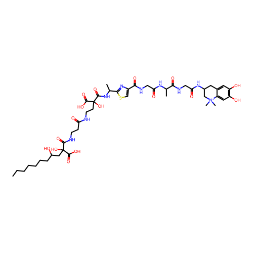 | SMILES | CCCCCCCC(O)CC(O)(C(=O)O)C(=O)NCCC(=O)NCCC(O)(C(=O)O)C(=O)NC(C)C1=NC(C(=O)NCC(=O)NC(C)C(=O)NCC(=O)NC2CC3=CC(O)=C(O)C=C3[N+](C)(C)C2)=CS1 |