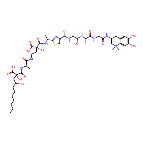 | SMILES | CCCCCCCC(O)CC(O)(C(=O)O)C(=O)NC(C)C(=O)NCCC(O)(C(=O)O)C(=O)NC(C)C1=NC(C(=O)NCC(=O)NC(C)C(=O)NCC(=O)NC2CC3=CC(O)=C(O)C=C3[N+](C)(C)C2)=CS1 |