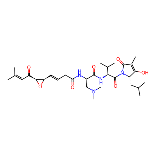 | SMILES | CC(C)=CC(=O)[C@@H]1O[C@@H]1/C=C/CC(=O)N[C@H](CN(C)C)C(=O)N[C@H](C(=O)N1C(=O)C(C)=C(O)[C@@H]1CC(C)C)C(C)C |