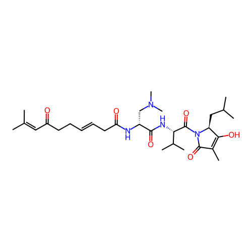 | SMILES | CC(C)=CC(=O)CC/C=C/CC(=O)N[C@H](CN(C)C)C(=O)N[C@H](C(=O)N1C(=O)C(C)=C(O)[C@@H]1CC(C)C)C(C)C |