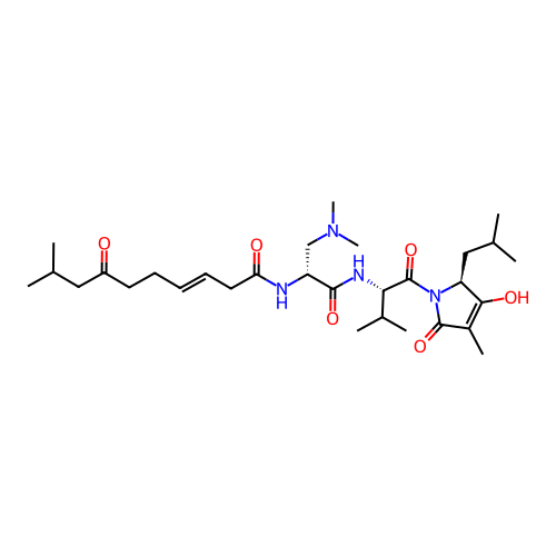 | SMILES | CC1=C(O)[C@H](CC(C)C)N(C(=O)[C@@H](NC(=O)[C@@H](CN(C)C)NC(=O)C/C=C/CCC(=O)CC(C)C)C(C)C)C1=O |