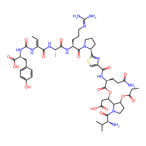| SMILES | C/C=C(\NC(=O)N[C@@H](CC1=CC=C(O)C=C1)C(=O)O)C(=O)N[C@@H](C)C(=O)N[C@@H](CCCN=C(N)N)C(=O)N1CCC[C@H]1C1=NC(C(=O)N[C@@H](CCC(N)=O)C(=O)OC(CC(=O)O)C2C(OC(=O)CC)CCN2C(=O)[C@@H](N)C(C)C)=CS1 |