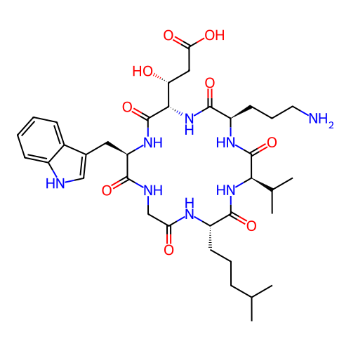 | SMILES | CC(C)CCC[C@@H]1NC(=O)CNC(=O)[C@@H](CC2=C[NH]C3=CC=CC=C23)NC(=O)[C@H]([C@H](O)CC(=O)O)NC(=O)[C@@H](CCCN)NC(=O)[C@@H](C(C)C)NC1=O |