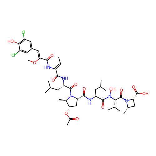 | SMILES | C/C=C(\NC(=O)/C(=C/C1=CC(Cl)=C(O)C(Cl)=C1)OC)C(=O)N[C@@H](CC(C)C)C(=O)N1[C@H](C(=O)N[C@@H](CC(C)C)C(=O)N(O)[C@H](C(=O)N2[C@@H](C)C[C@H]2C(=O)O)C(C)C)C[C@H](OC(C)=O)[C@H]1C |